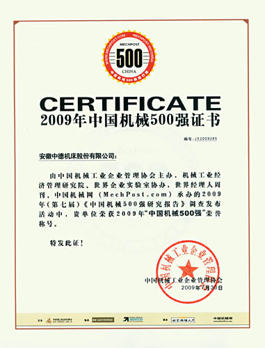 由中國機械工業企業管理協會主辦,機械工業經濟管理研究院、世界企業實驗室協辦,世界經理人周刊、中國機械網承辦的2009年(第七屆)《中國機械500強研究報告》調查活動公布,中德機床榮獲2009年“中國機械500強”。